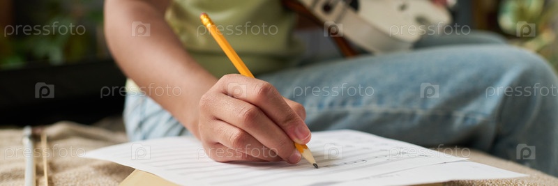 Человек пишет заметки, сидя в помещении