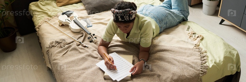 Композиция музыки на кровати с музыкальными инструментами поблизости