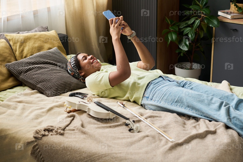 Подростковая девушка отдыхает дома с скрипкой поблизости