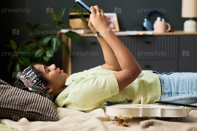 Девушка-подросток лежит на диване и просматривает мобильный телефон