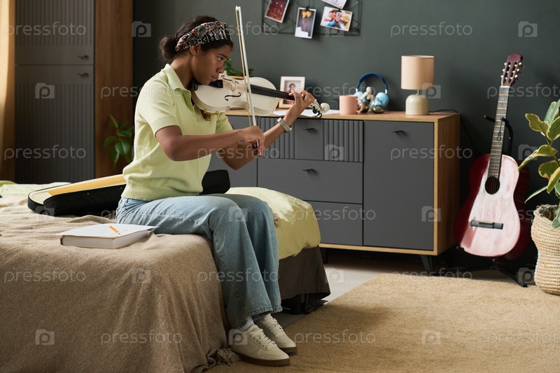 Практика игре на скрипке в уютной спальне с элементами декора