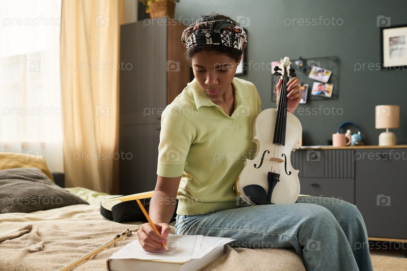 Портрет девочки-подростка, держащей скрипку и делающей заметки