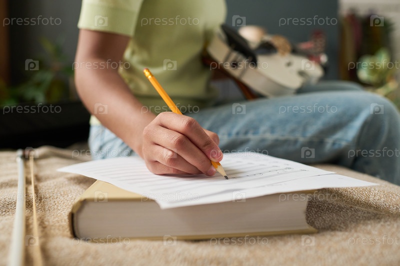 Письменные заметки на бумаге рядом с гитарой и открытой книгой
