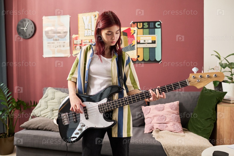 Играя на бас-гитаре в уютной обстановке гостиной