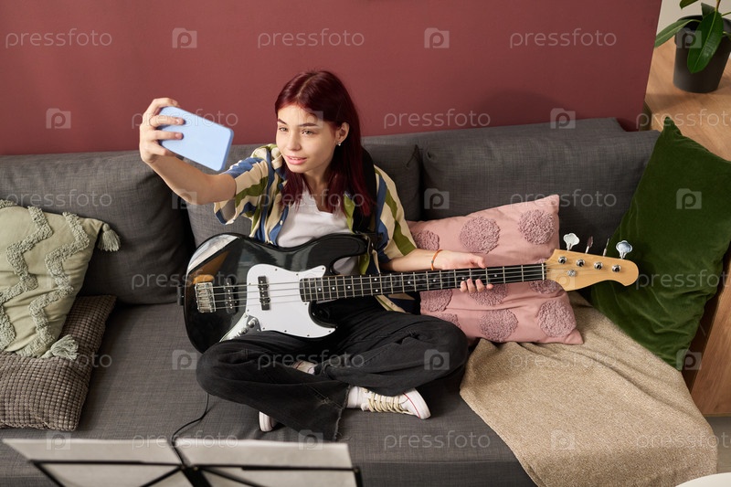Селфи, играя на электрическом бас-гитаре на диване