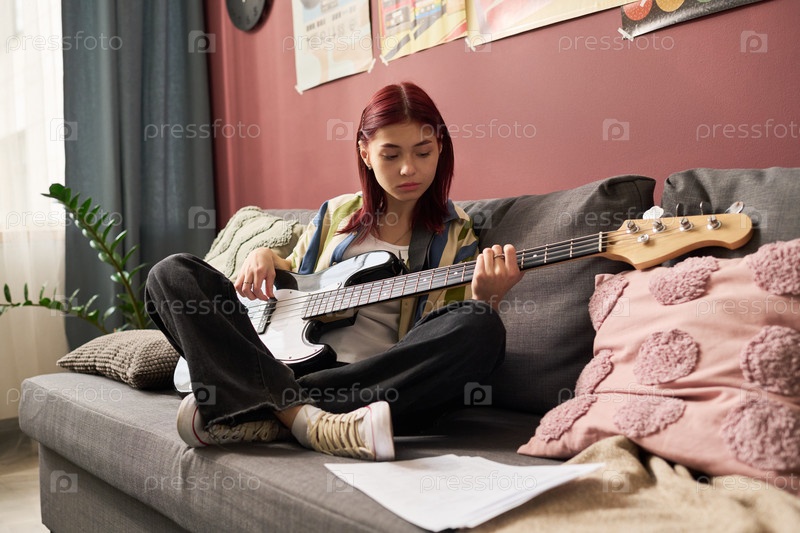 Подростковая девушка играет на бас-гитаре в уютной гостиной