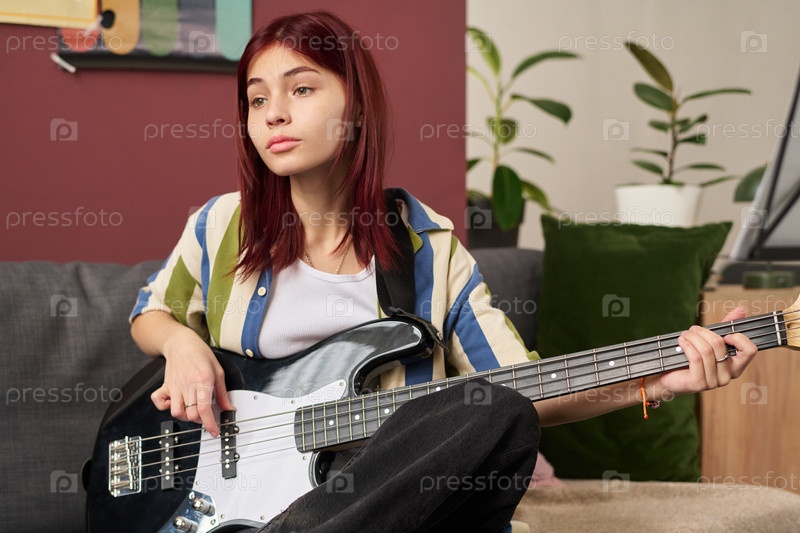 Девушка-подросток играет на электрической гитаре на диване