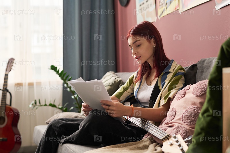 Документ чтения с растением и гитарой на заднем плане