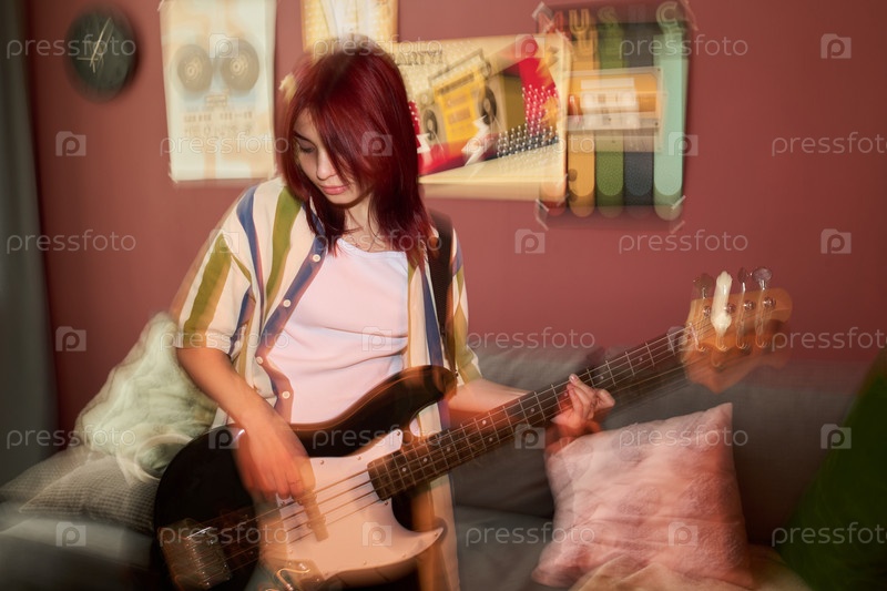 Играя на электрическом бас-гитаре в уютной гостиной