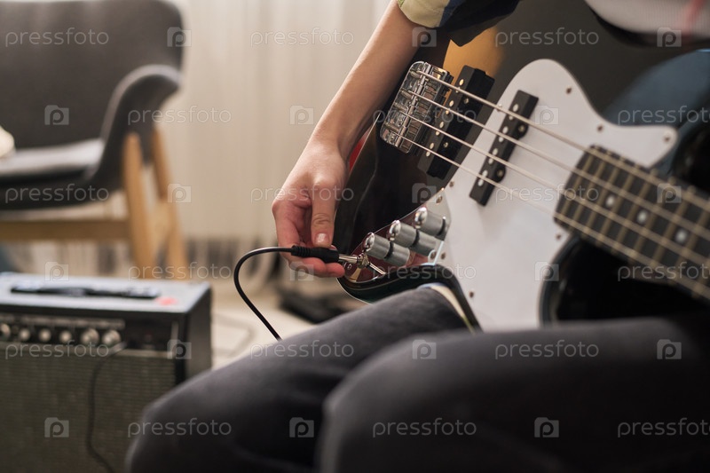 Играть на электрическом бас-гитаре в обстановке гостиной