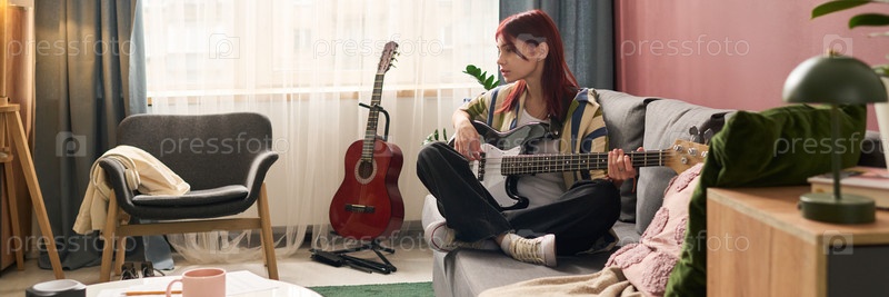 Играя на бас-гитаре в уютной обстановке гостиной