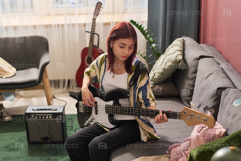 Практика бас-гитары в уютной обстановке гостиной