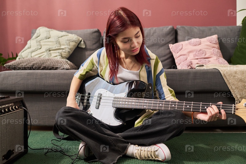 Играя на бас-гитаре в обстановке гостиной