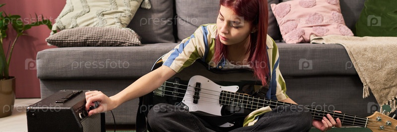Подростковая девушка регулирует усилитель для игры на бас-гитаре