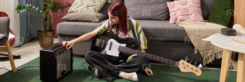 Регулирование усилителя сидя на ковровом полу, практикуя гитару