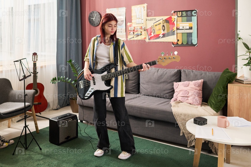 Подростка играет на электрической бас-гитаре в уютной гостиной