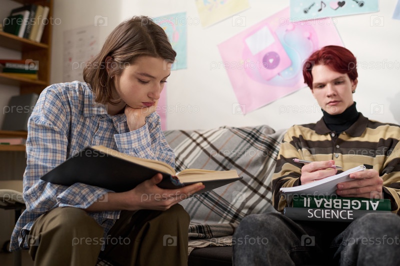 Два подростка учатся, держа в руках открытые книги