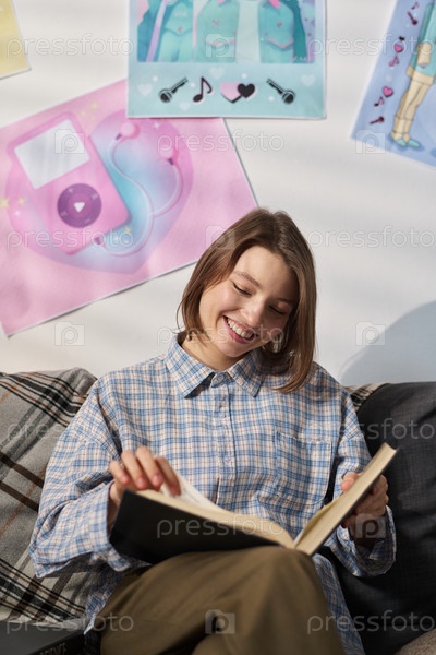 Улыбающаяся девочка-подросток читает на диване под солнцем