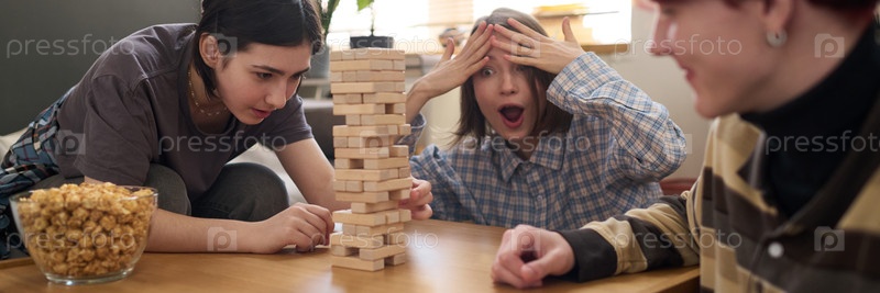 Заголовок изображения Подростки играют в настольные игры Балансирование деревянной башни
