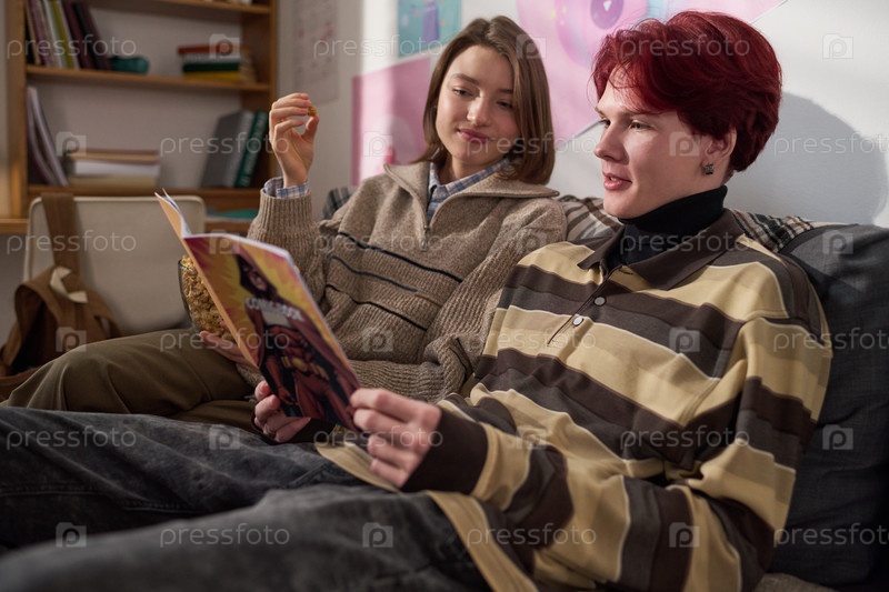Мальчик-подросток читает комиксы с другом