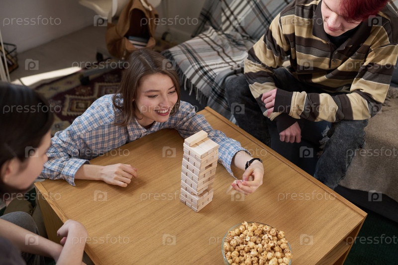 Улыбающаяся девочка-подросток тянет блок из деревянной башни