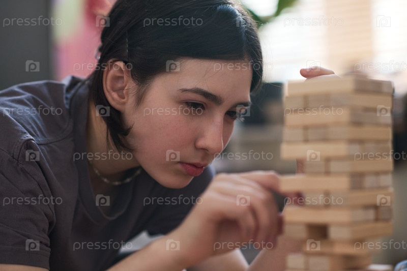 Девушка-подросток аккуратно удаляет блок из деревянной башни