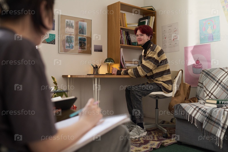 Улыбающийся мальчик-подросток выполняет домашнее задание Изучается за столом