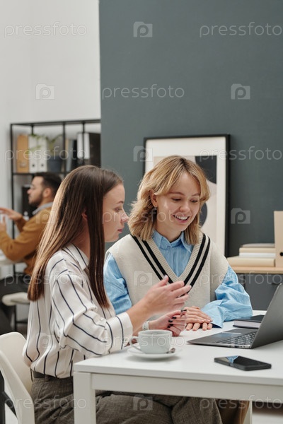 Две улыбающиеся деловые женщины в офисе используют ноутбук