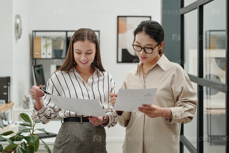 Две улыбающиеся женщины, держащие документы, стоя в офисной обстановке