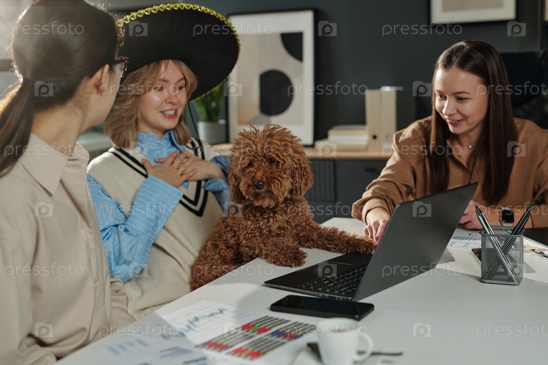 Женщины в офисе весело разговаривают с девушкой, носящей шляпу сомбреро