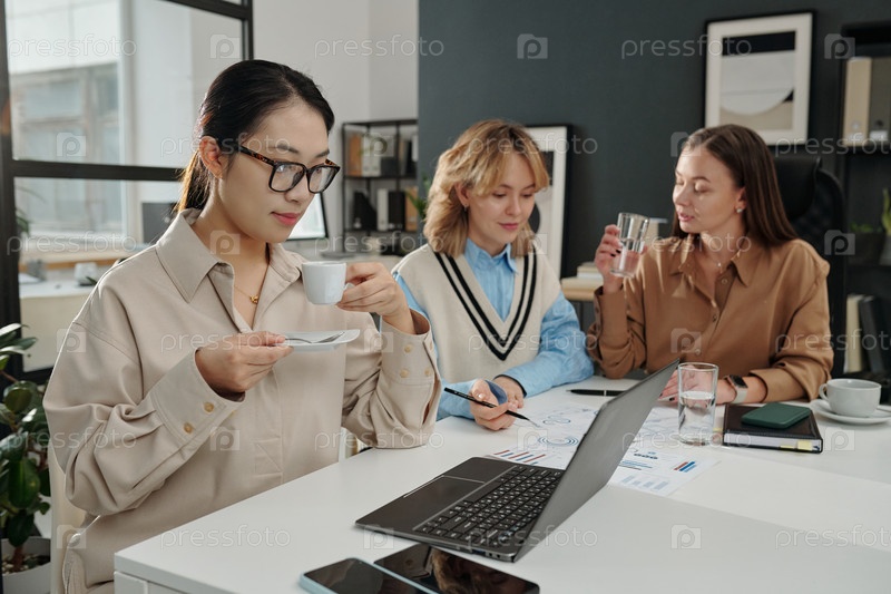 Азиатская женщина пьет чашку кофе на деловой встрече