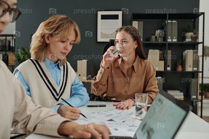 Женская бизнес-лидерка пьет стакан воды на занятой рабочей встрече