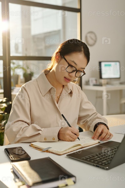 Азиатская бизнесвумен носит очки в офисе, освещенном солнечным светом