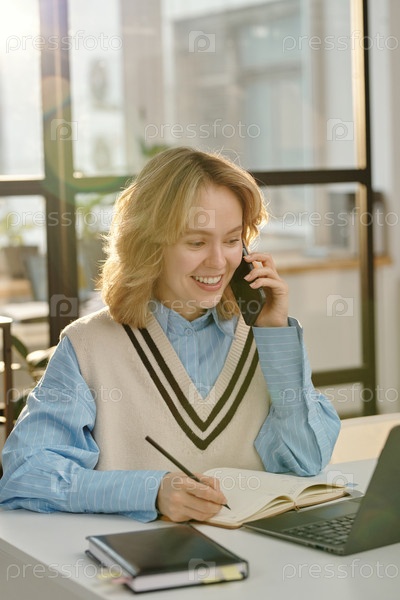 Улыбающаяся бизнесвумен, звонящая по телефону в Планировщике в офисе Lit By Sunlight