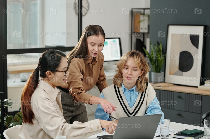 Деловая женщина, указывающая на экран ноутбука на рабочем совещании