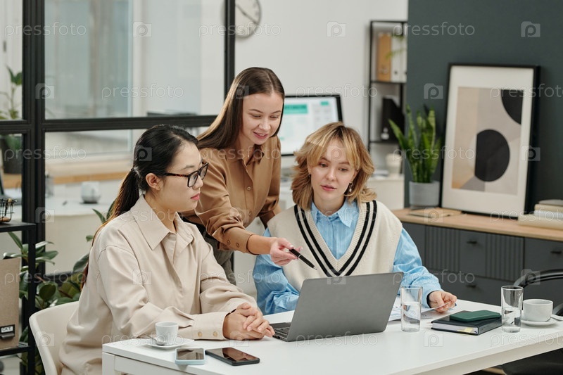 Улыбающаяся менеджерка использует ноутбук на рабочем совещании