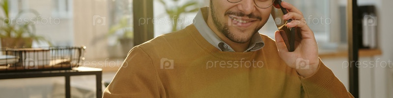 Улыбающийся мужчина разговаривает по телефону в офисе, освещенный солнечным светом Header Image