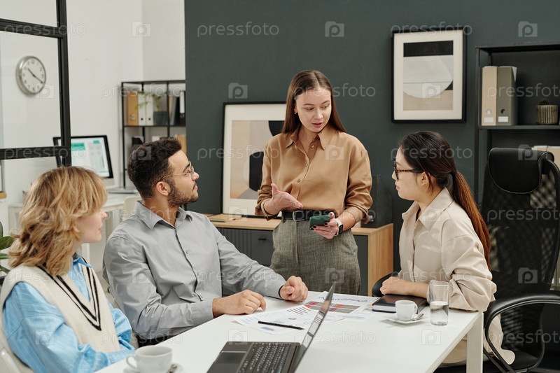 Женщина, обсуждающая маркетинг в бизнесе Встреча с командой в офисе
