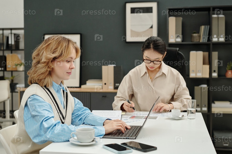 Две бизнес-женщины сосредоточены на работе в офисе