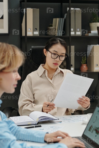 Азиатская бизнесвумен читает документ на деловой встрече в офисе