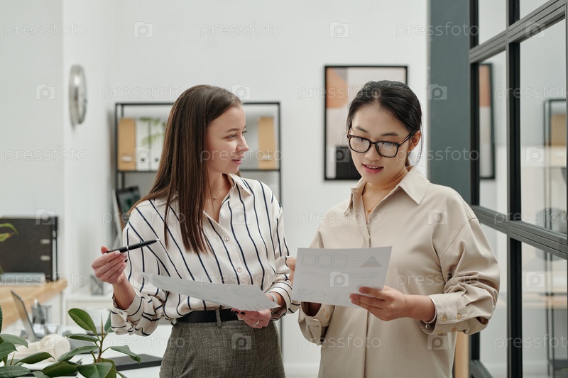 Две бизнес-женщины читают документы, стоящие в офисе