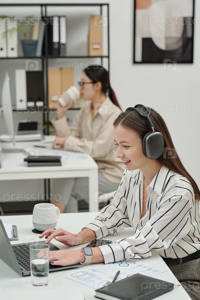 Улыбающаяся деловая женщина, носящая наушники на онлайн-встрече