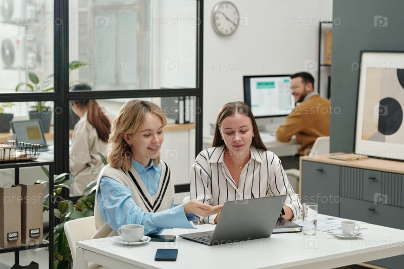 Две улыбающиеся женщины, работающие на ноутбуке во время встречи в офисе