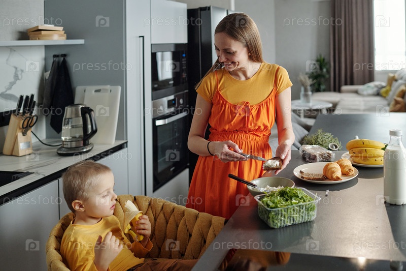 Счастливая мать у сына Здоровый завтрак по утрам