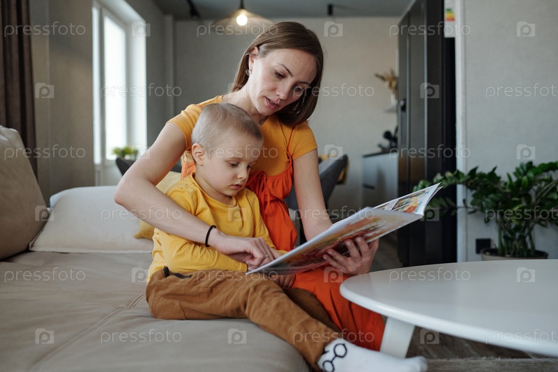 Заботливая мать читает книгу сыну