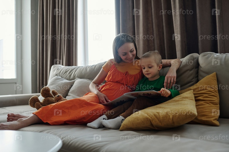 Счастливая мама читает книгу с ребенком, отдыхающим на диване