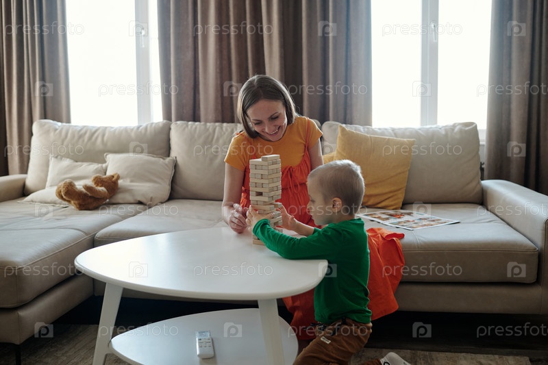 Мать и сын играют в игру с деревянной башней