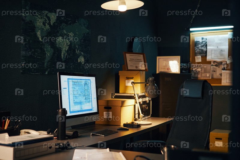 Освещенное рабочее пространство в современном офисе со светящейся настольной лампой