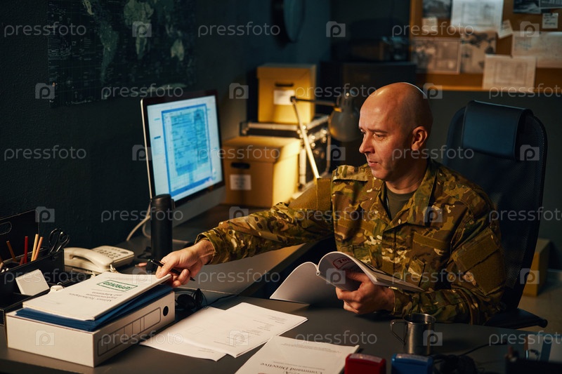 Военный офицер просматривает документы за столом