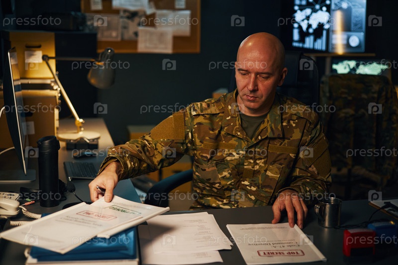 На рабочем столе в военном офисе, рассматривающем документы